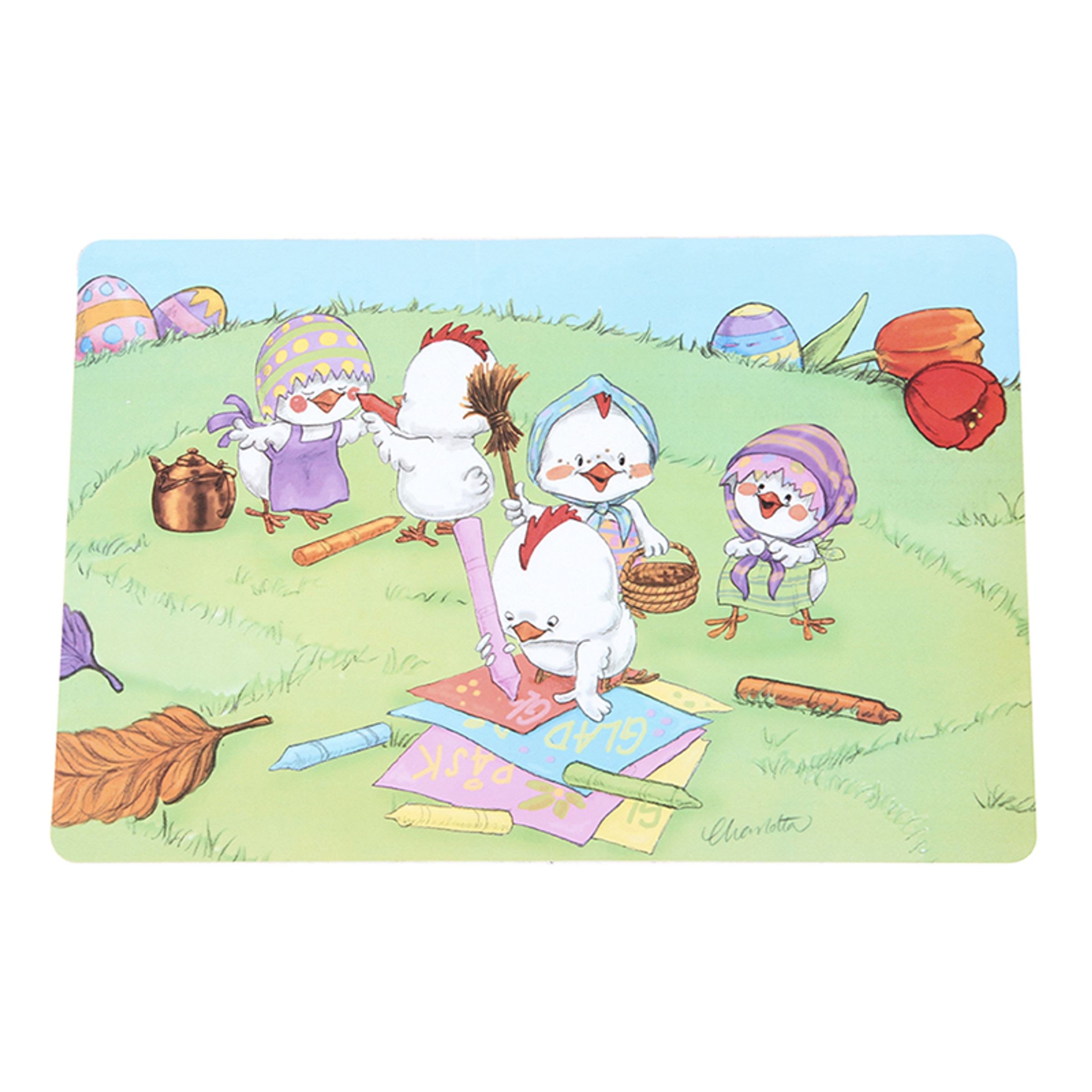 Bordstablett Påskmotiv är en färgglad bordstablett med ett påskmotiv. På bordstabletten finns små kycklingar som klätt ut sig till påskkärringar och skriver påskkort. Den är tillverkad i plast och kan enkelt torkas av med en fuktig trasa och användas flera gånger. Bordstabletten är tillverkad i plast och är 43 x 28 cm stor.