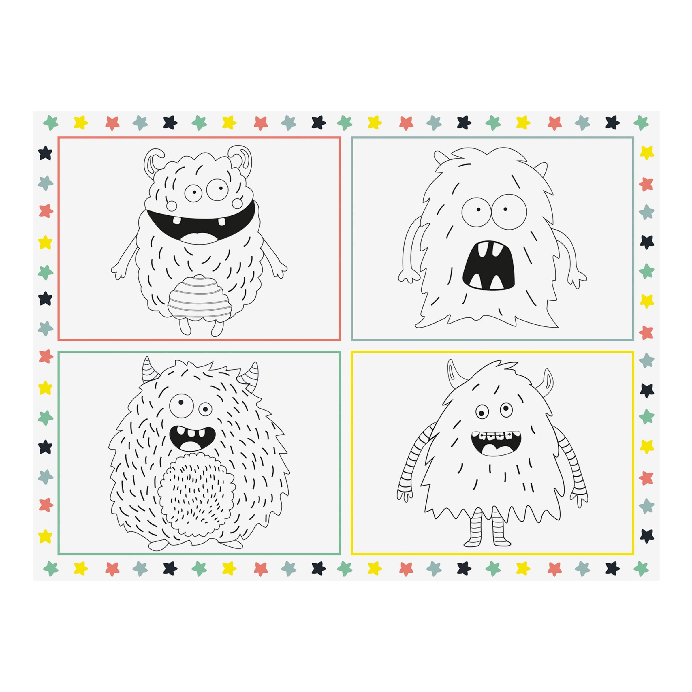 Ge barnen en rolig aktivitet nästa kalas och låt dom färglägga sin egen bordstablett! Varje papper kommer med färdigstreckade linjer i form av busiga monster som hoppar och dansar i takt till födelsedagssången!