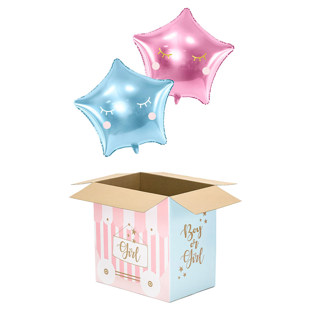 Avslöja bebisens kön på ett roligt, spännande och riktigt festligt sätt med denna fina boy or girl ballongbox! Dekorativ ballonglåda som enkelt fylls med blåa eller rosa heliumballonger inför firandet. När det äntligen är dags för att berätta bebisens kön för dina nära och kära öppnar du enkelt lådan så att ballongerna flyger upp och avslöjar sin färg. En superfestlig baby shower ballonglåda som inte bara bjuder på en ett nervkittlande avslöjande, utan också blir en riktigt fin dekoration till firandet.