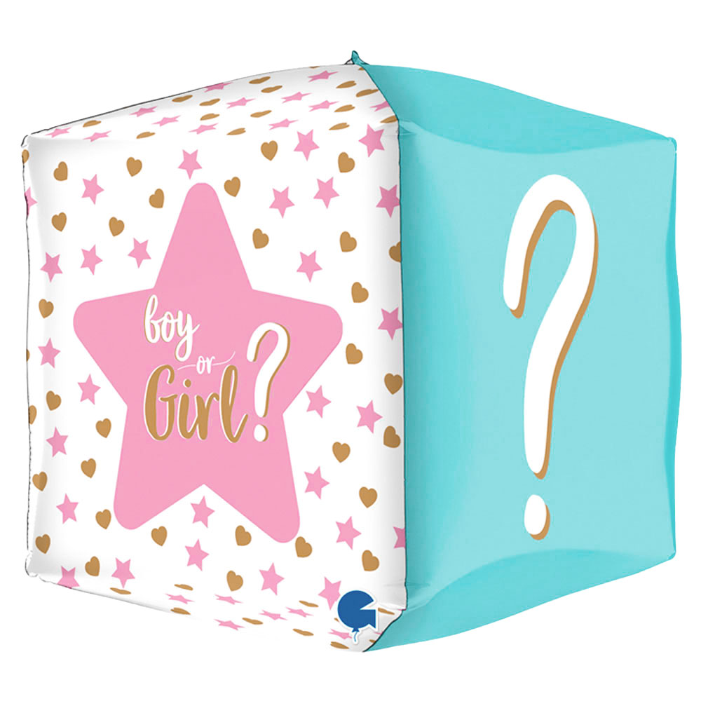 Boy or Girl Fyrkantig Folieballonger innehåller en vit fyrkantig folieballong med texten "Boy or Girl?" på ena sidan och texten "Girl or Boy?" på andra sidan. Ballongen pryds även av blåa och rosa stjärnor, guldiga hjärtan och stora frågetecken.