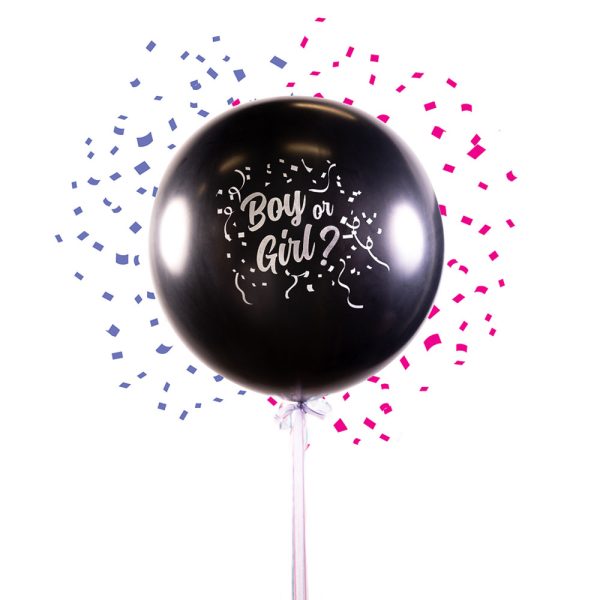 Boy or Girl Jätteballong omfattar en stor, svart latexballong med texten "Boy or Girl?", en blå-grön konfetti samt en rosa-lila konfetti. Fyll ballongen med önskad konfetti och blås därefter upp den med luft eller helium. Ballongen blir ca 65 cm stor uppblåst.