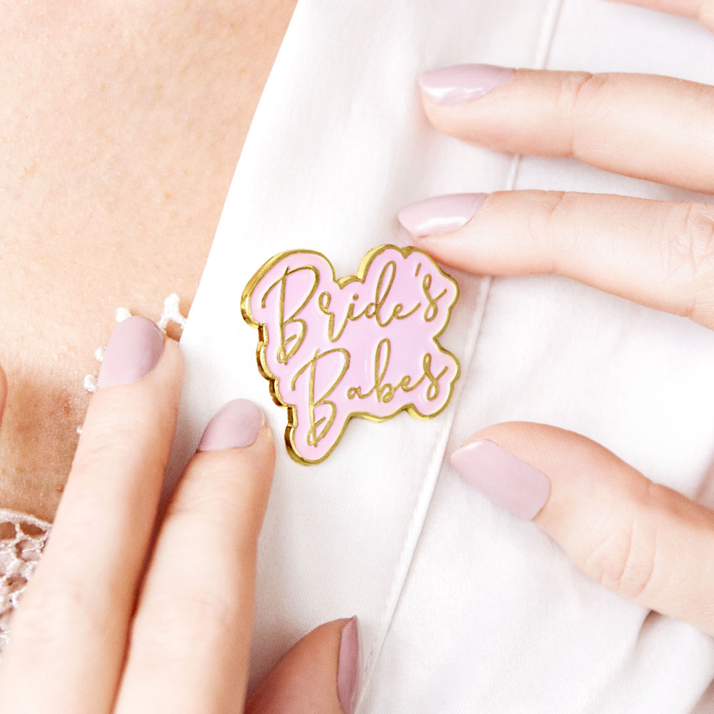 Bride's Babes Brosch innehåller en brosch i ljusrosa med guldkanter och texten "Bride's Babes" i guld.
