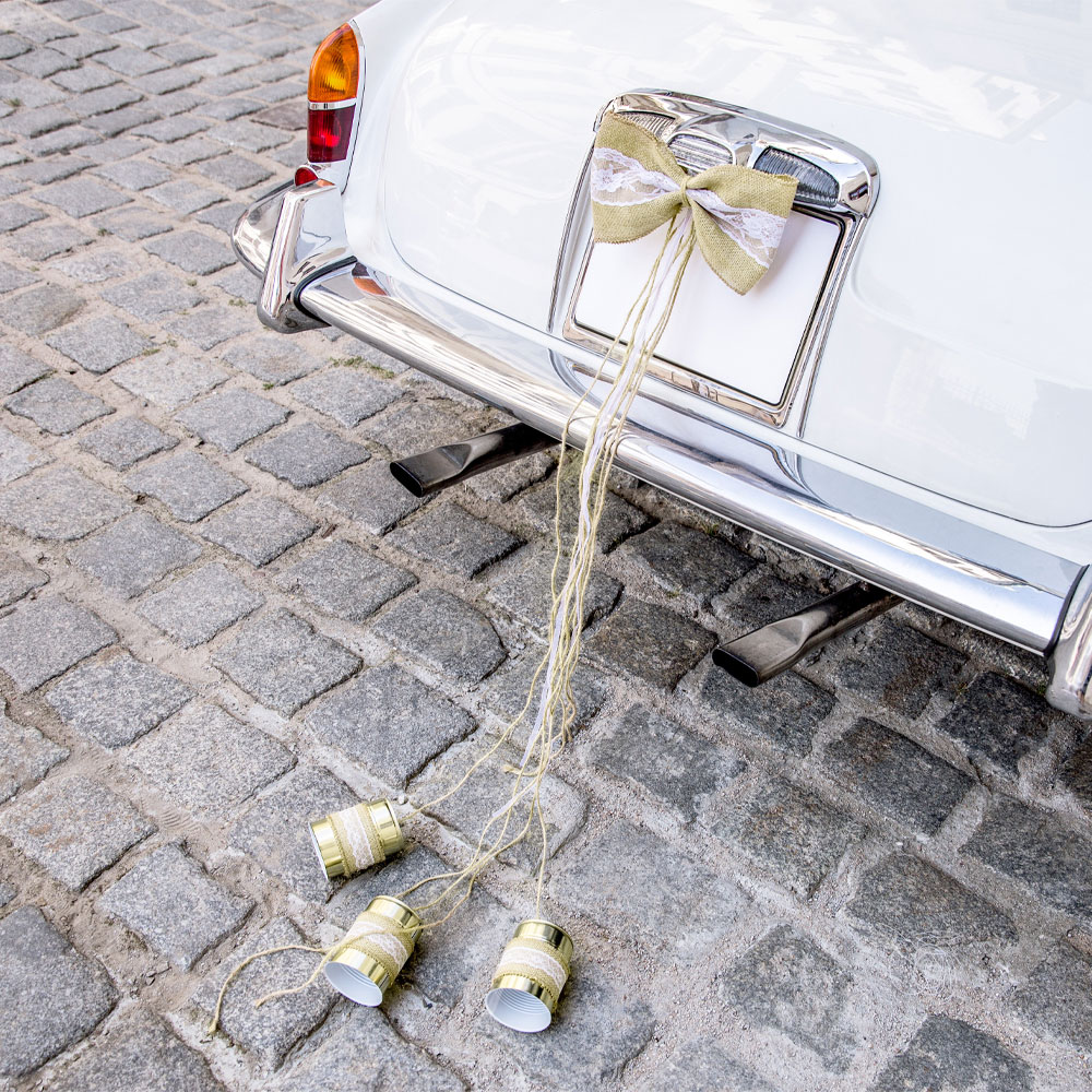 Förvandla din bil till en romantisk bröllopsbil på bara några korta minuter med hjälp av detta fina dekoration set! Ett välfyllt och riktigt snyggt bröllopsdekoration set med fina juterosetter i olika storlekar och skramlande metallburkar i guld som du snabbt och enkelt fäster på din bil. Riktigt fina rosetter och metallburkar som blir en utmärkt bildekoration till bröllop i rustikt eller bohemiskt tema.