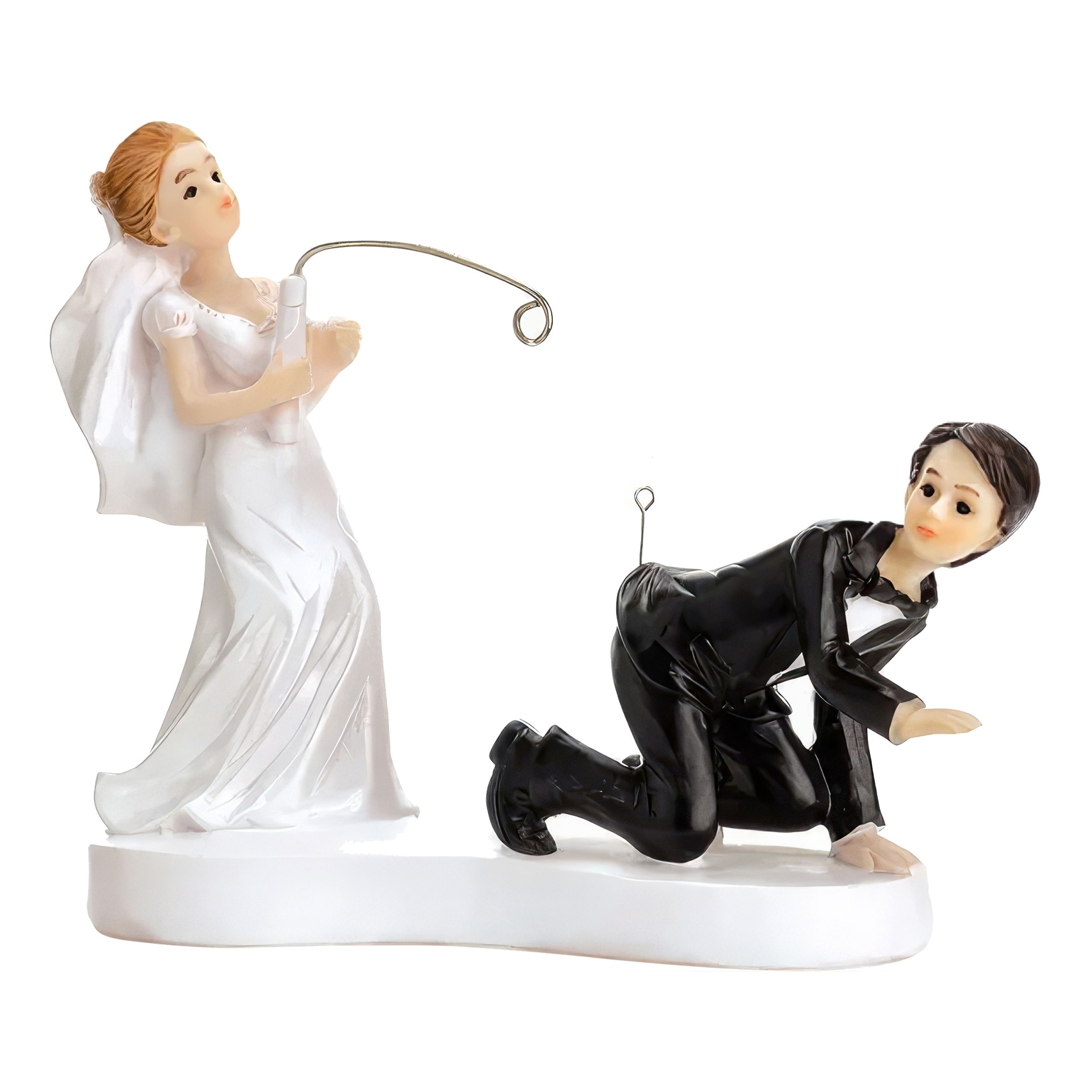 Antingen har du fått en riktigt ful fisk på kroken, eller så har du en gränslös passion till sportfiske. Eller träffade du din partner på öppet vatten, på ett hav lika stormigt som er relation? Då passar den här skojfriska bröllopsfiguren perfekt på tårtan, som föreställer en brud med fiskespö som vevar in sin man.