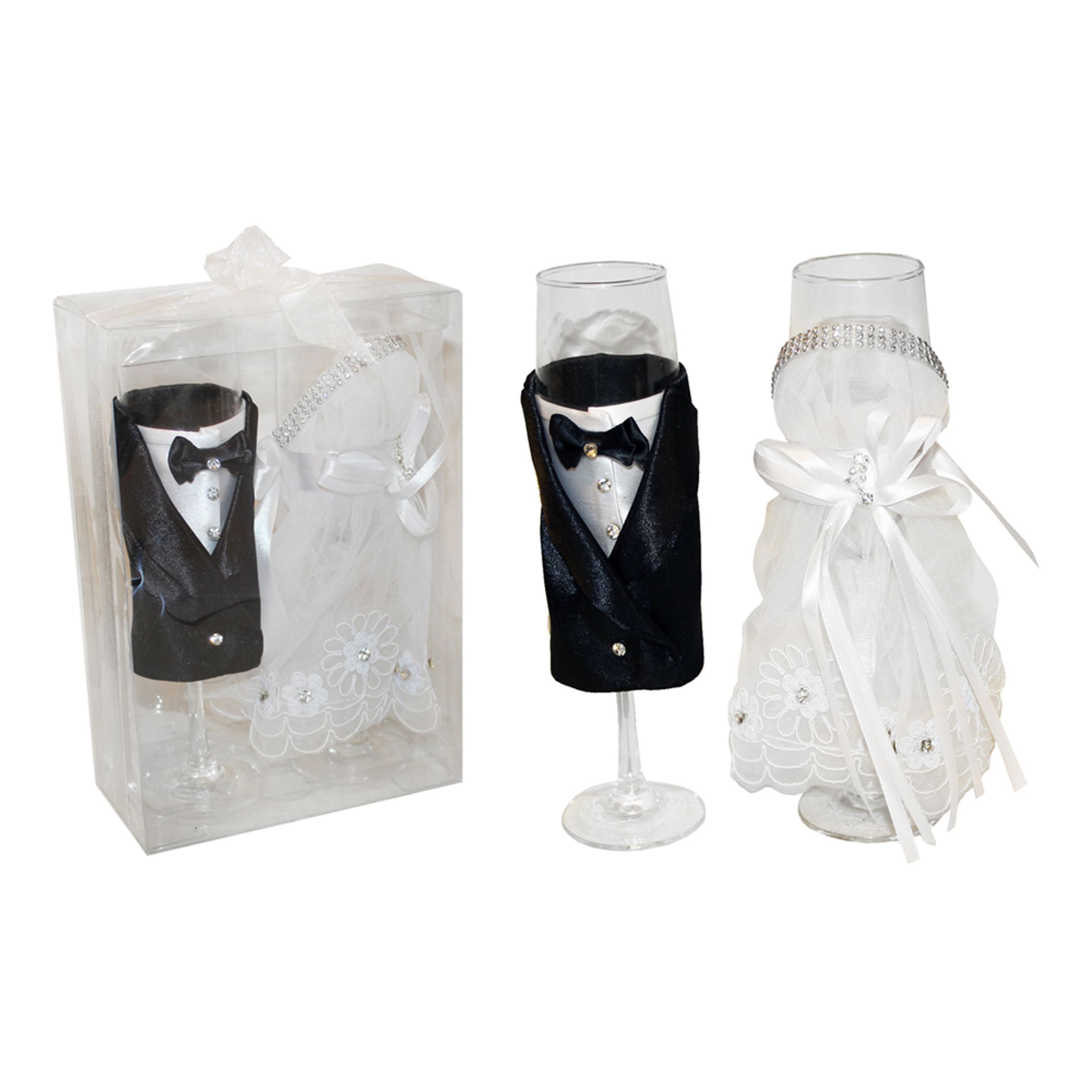 Bröllopsglas Mr & Mrs inkluderar två glas på fot. Det ena glaset har ett överdrag som ser ut som en mörk kostym med fluga och det andra glaset har en vit brudklänning. Materialet är glas och polyester och de är 22 cm höga.