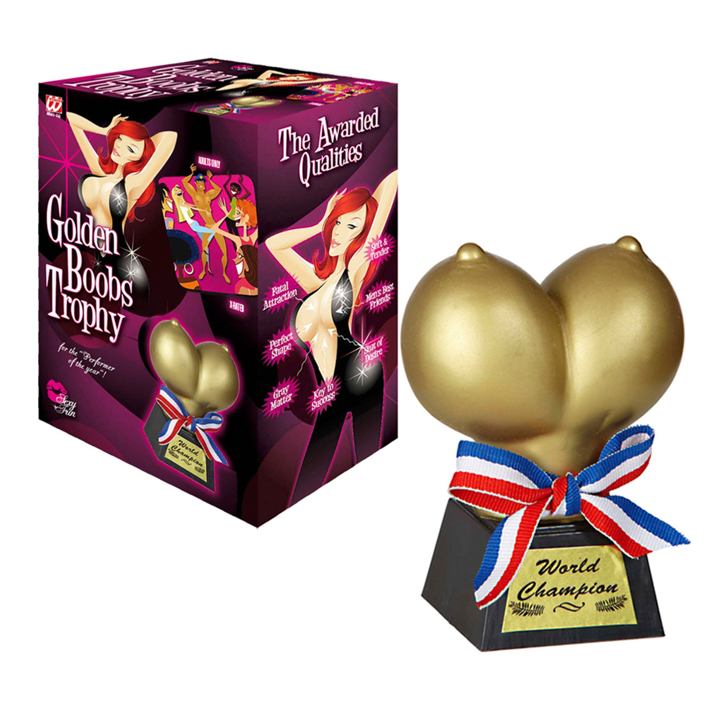 Den perfekta presenten att ge till flickvännen! Bröstpokalen består av ett par guldfärgade, mjuka bröst på en svart bas av plast med inskriptionen "World Champion". Storlek: ca 12 cm hög.