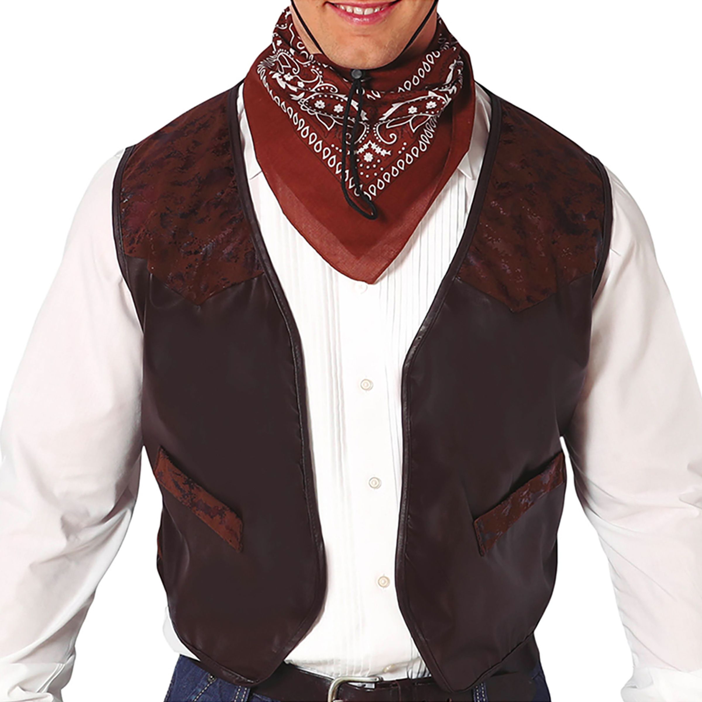 Brun Cowboyväst är en riktigt klassisk läderliknande väst för alla cowboy's där ute! Matcha tillsammans med skjorta, cowboyhatt, lasso och boots så är du som tagen ur en vilda västern-film!