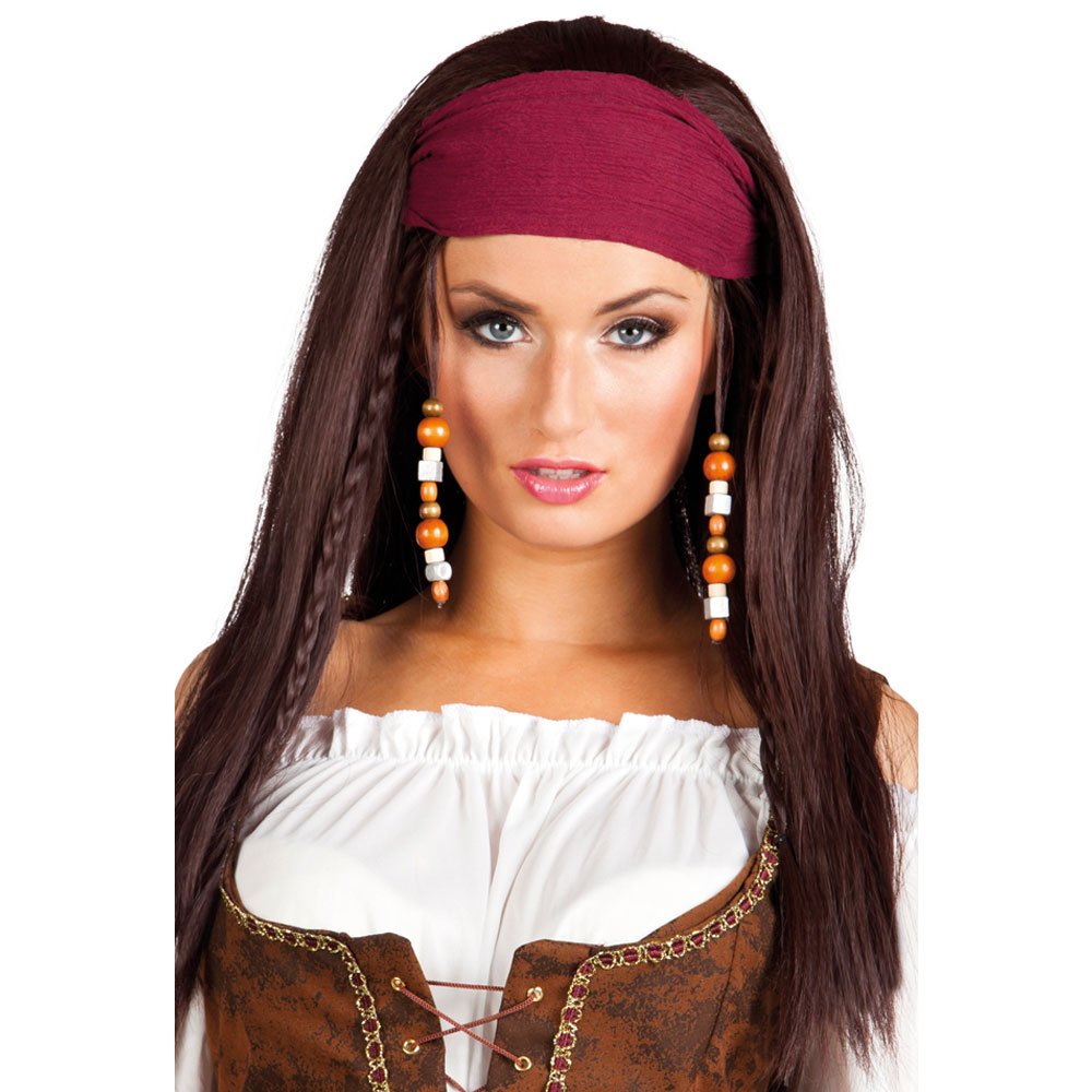 Brun Piratperuk med Bandana omfattar en brun peruk med flätor och pärlor i håret samt en vinröd bandana.