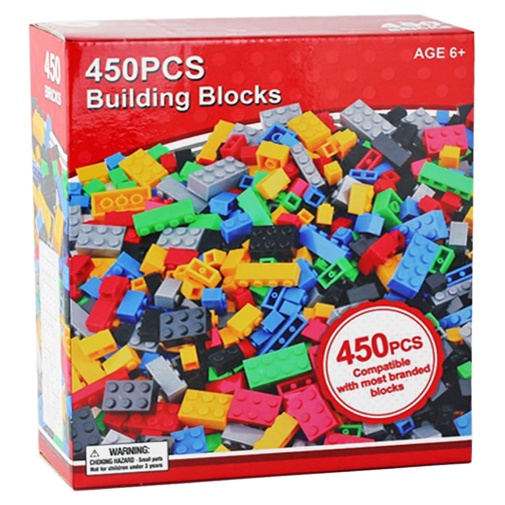 Byggklossar 450-pack omfattar ett 450-pack lego-liknande lekklossar i flera olika färger och former. Klossarna är tillverkade av plast och passar barn från 6 år och uppåt.