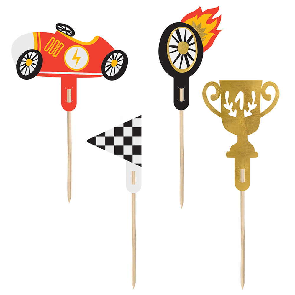 Cake Toppers Racing 4-pack består av fyra cake toppers i form av en pokal, ett hjul med utstickande flammor, en racerbil och en tävlingsflagga.