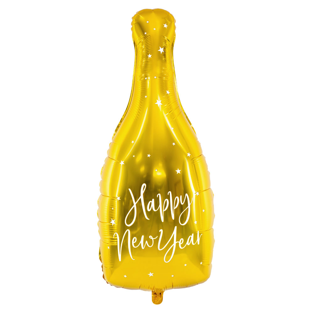 Champagneflaska Happy New Year Folieballong innehåller en guldig folieballong i form av en champagneflaska med texten "Happy New Year" samt stjärnmotiv i vitt.
