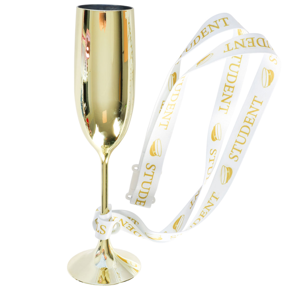 Champagneglas Student med Band omfattar ett studenthänge i form av ett guldfärgat champagneglas. Ett vitt band, dekorerat med studentmössor och texten "STUDENT" i guldfärg, medföljer så du kan bära den runt halsen.