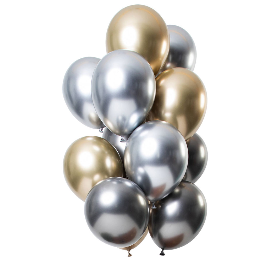 Chrome Mirror Ballonger Silver & Guld Mix omfattar en ballong mix med silvriga, guldiga och metallgrå ballonger med chrome mirror effekt.