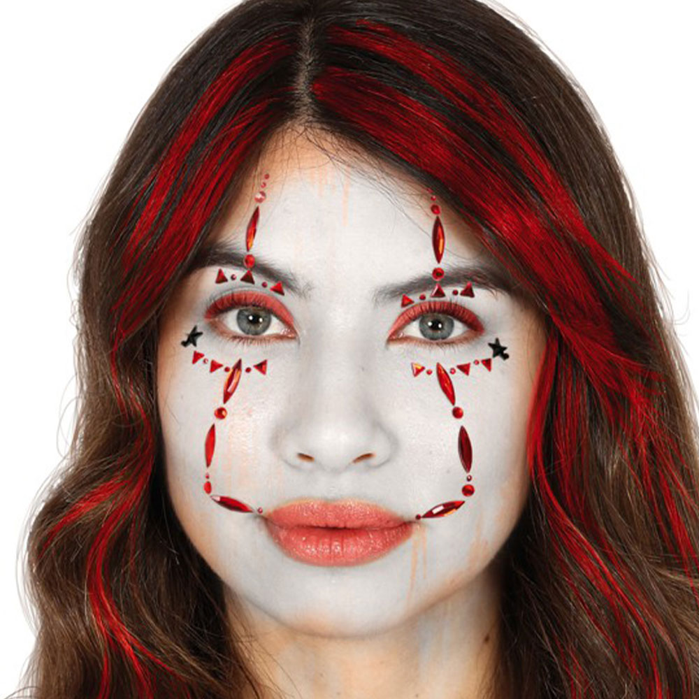 Clown Ansiktssmycken Röd består av sju ansiktssmycken med röda diamanter och svarta stjärnor som sitter på genomskinliga stickers med självhäftande baksida. Applicera ansiktssmycket genom att försiktigt dra av hela stickern från plasten och tryck det mot ren och torr hud.