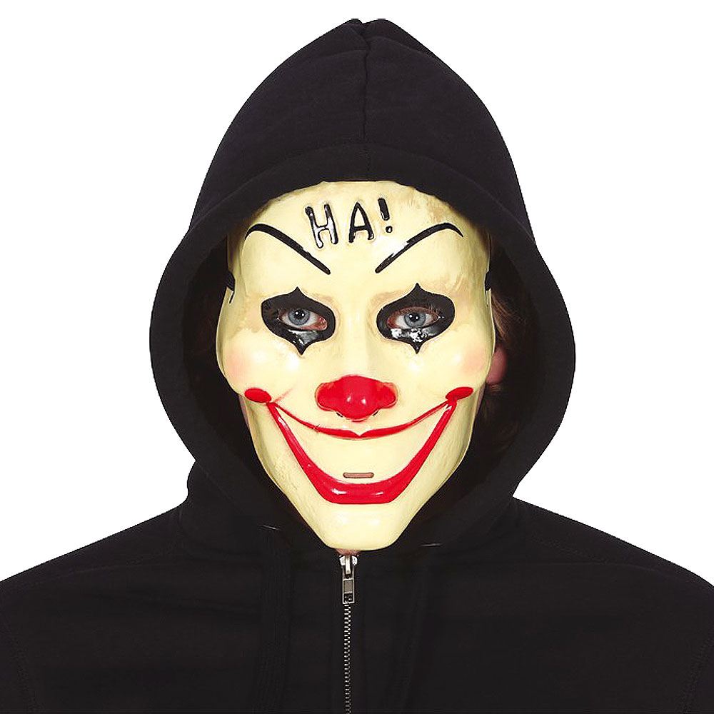 Clown Mask Ha! omfattar en mask i gammaldags stil som föreställer en clown med gammaldags clownsminkning och texten "Ha!" i pannan. Masken har hål för ögon och näsa och hålls på plats med hjälp av elastiskt band. Masken är tillverkad i mjukare plast och passar vuxna.
