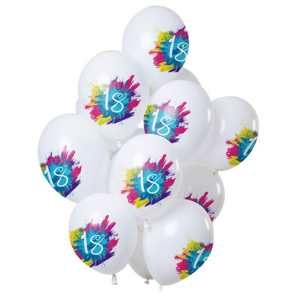 Color Splash 18-års Ballonger Latex omfattar vita ballonger med färgglatt mönster med texten "18" i vitt.