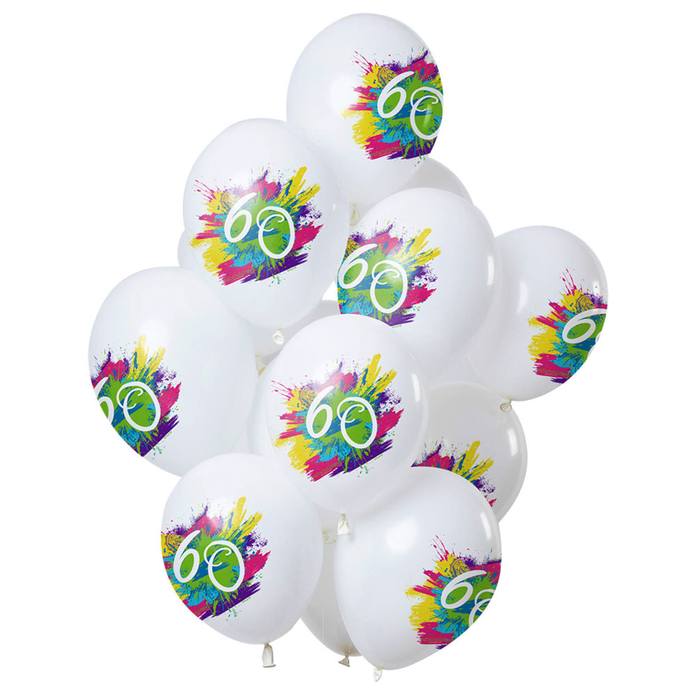 Color Splash 60-års Ballonger Latex omfattar vita latexballonger med färgglatt mönster samt siffran "60".