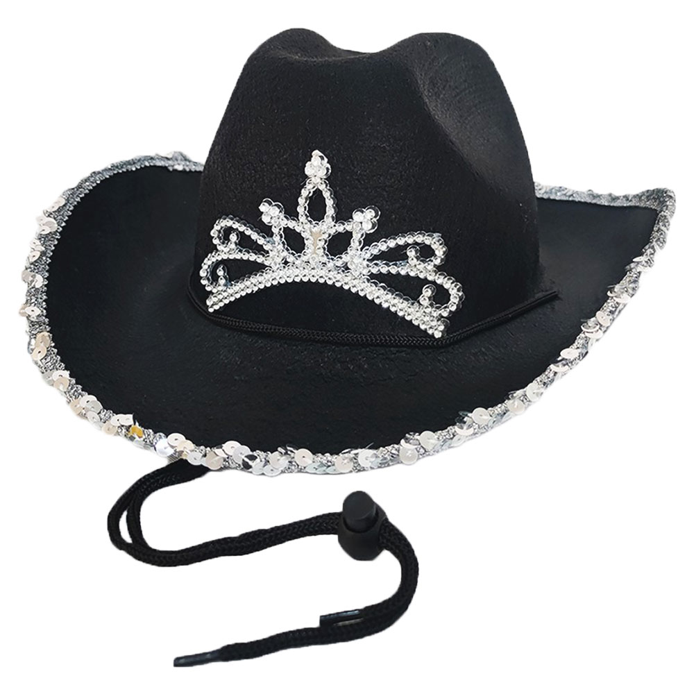 Cowboyhatt med Glitter Svart omfattar en svart cowboyhatt med glitter och paljetter i silver på kanten och motiv av en krona av små silvriga plaststenar framtill. Hatten har en omkrets på ca 60 cm och har ett snöre som kan dras åt om halsen. Cowboyhatten är tillverkad i filtliknande polyester och passar vuxna.