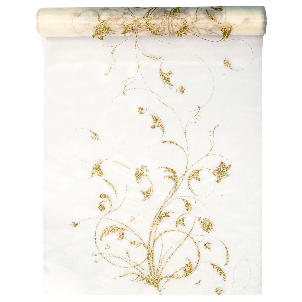 Vill du dekorera din fest eller ditt kalas på ett enkelt och riktigt elegant sätt så är det här organzatyget ett utmärkt val för dig! Super snyggt cream-färgat organzatyg med guldigt glitter-mönster som du enkelt kan dekorera nästan vad som helst med. Ett både snyggt och praktisk organzatyg som gör det enkelt att få till en riktigt strålande fest!