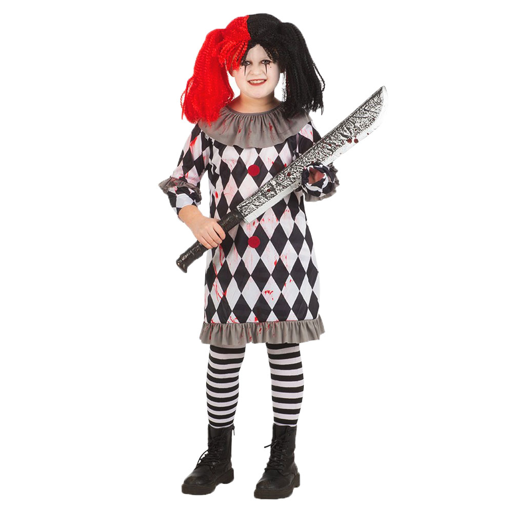 Creepy Clown Klänning Barn omfattar en blodstänkt clowndräkt i form av en svart-och vitrutig klänning med röda tofsar som knappar på magen och grå volangkrage om halsen och på ärmarna. Klänningen passar barn och är tillverkad i polyester.
