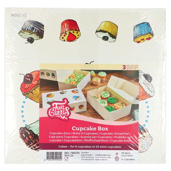 Cupcake Kartong Muffins omfattar tre stycken vita bakelsekartonger av papp med fina illustrationer av olika muffins. Varje kartong rymmer 6 stycken vanliga cupcakes eller 15 stycken mini cupcakes. Kartongerna är ca 24 cm långa, 16 cm breda samt 8 cm höga. Cupcakehållare medföljer.