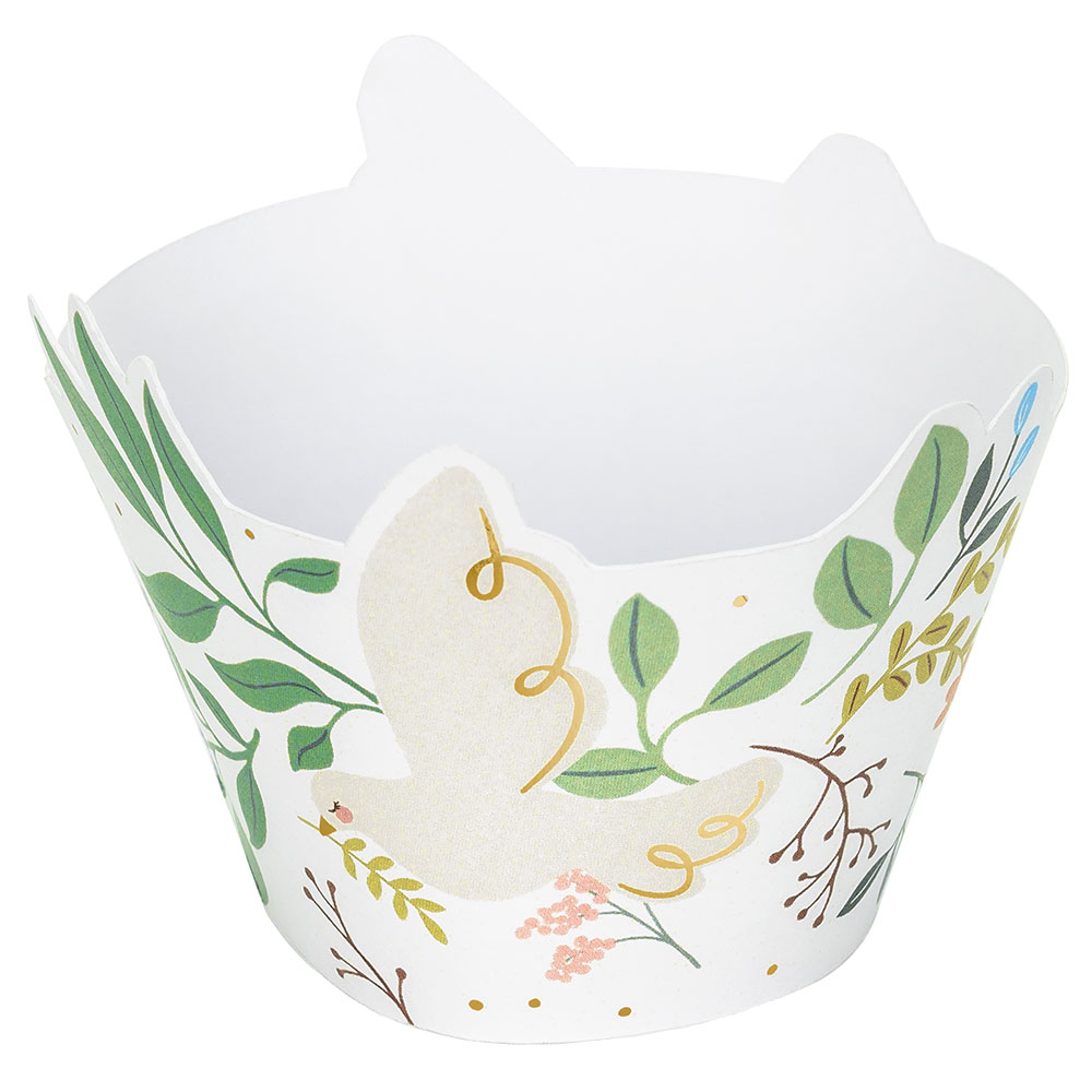 Cupcake Wrappers Blommor och Duvor omfattar sex stycken cupcake wrappers med motiv av blommor och blad samt duvor som fästs runt muffins efter att de gräddats för att ge de en fin dekoration.