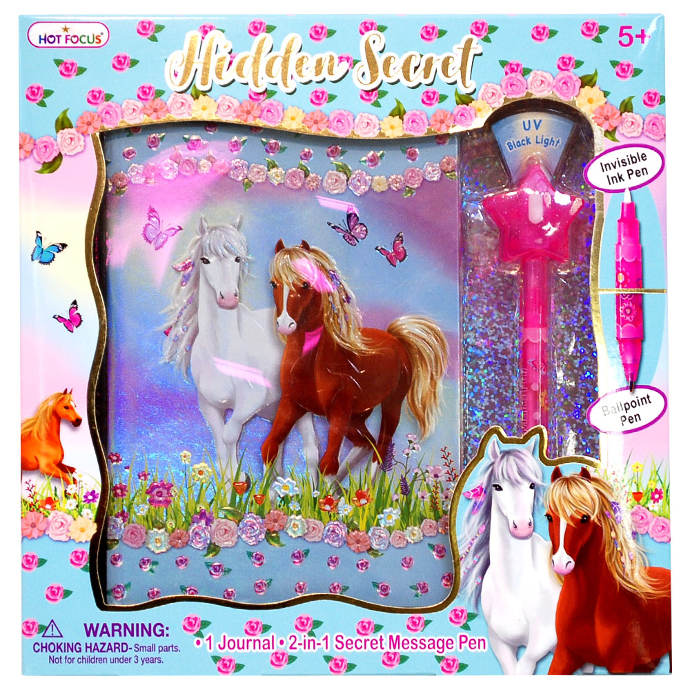Dagbok Hästar omfattar en skrivbok med motiv av hästar mot en skimrande bakgrund med blommor, gräs och fjärilar. Det ingår även en magisk penna med osynligt bläck i ena änden, vanlig kulspetspenna i andra änden och uv-ljus.