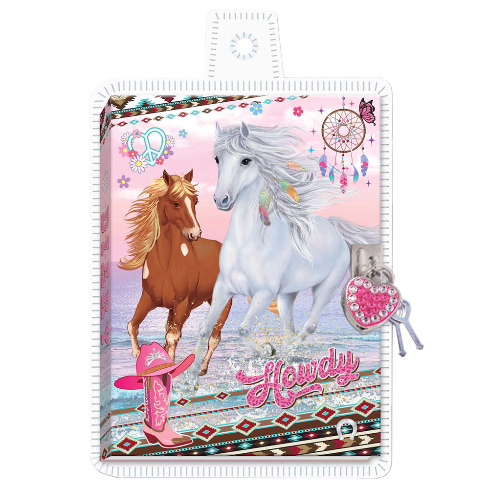 Dagbok med Lås Hästar omfattar en glansig rosa dagbok med motiv av en brun och en vit häst på fram- och baksida. Framsidan har även andra motiv i form av texten 'howdy' i rosa, en rosa cowboyhatt och stövlar, peacetecken kombinerat med ett hjärta och en drömfångare. Dagboken har ett hjärtformat lås med diamanter och två tillhörande nycklar med hjärtformad topp.