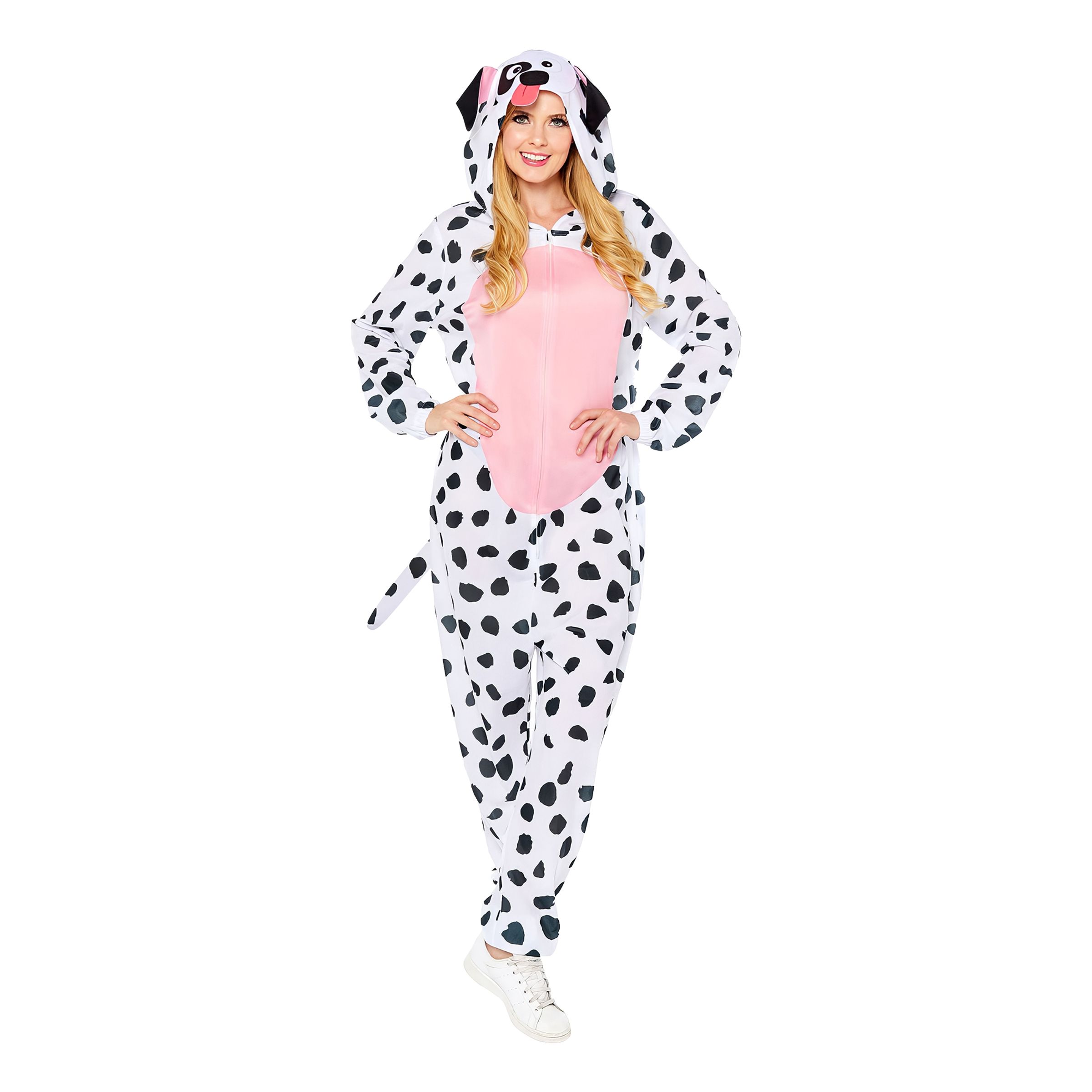 Dalmatiner Overall Maskeraddräkt inkluderar en vit jumpsuit med svarta prickar på – precis som en dalmatin! Magen är rosa och huvan föreställer ett hundhuvud med öron, ögon, näsa och tunga!