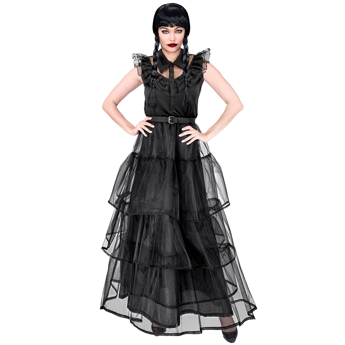 Dark Girl Maskeraddräkt omfattar en svart maskeraddräkt med en lång klänning med en fastsydd fluga samt ett skärp.