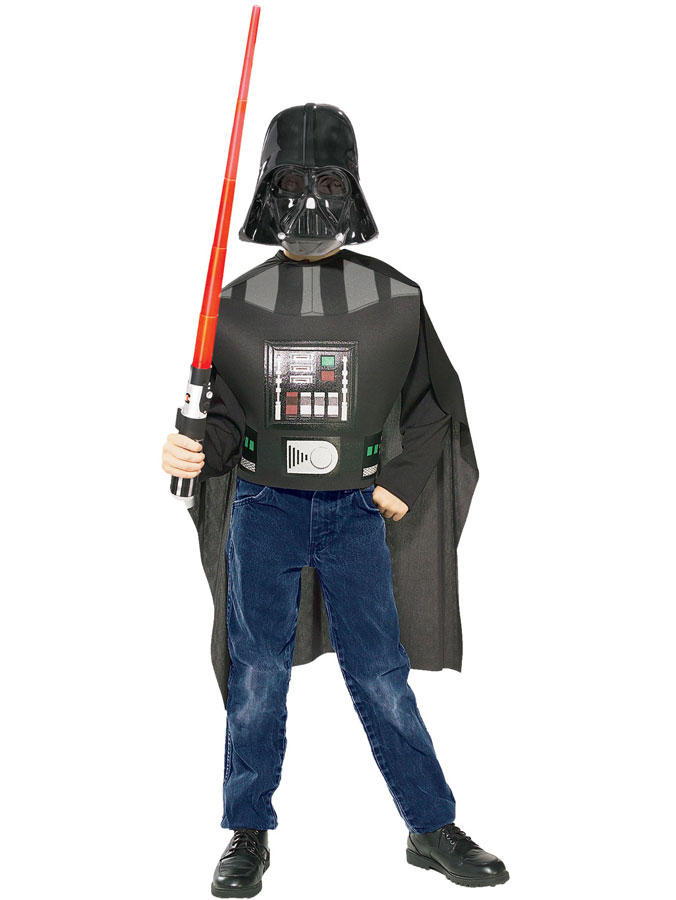 Darth Vader Dräkt Barn med Lasersvärd inkluderar en Darth Vader mask, ett bröststycke med fastsatt mantel, och ett lasersvärd.