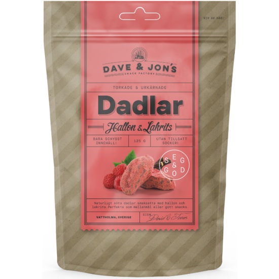 Dave & Jons Dadlar Hallon Lakrits erbjuder en spännande smakupplevelse där sötman från dadlar kombineras med syrliga hallon och intensiv lakrits. Varje bit ger en unik och njutbar balans mellan fruktig och salt smak. Perfekta som mellanmål eller som en överraskande ingrediens i desserter. Ett måste för alla som älskar kombinationen av bär och lakrits.