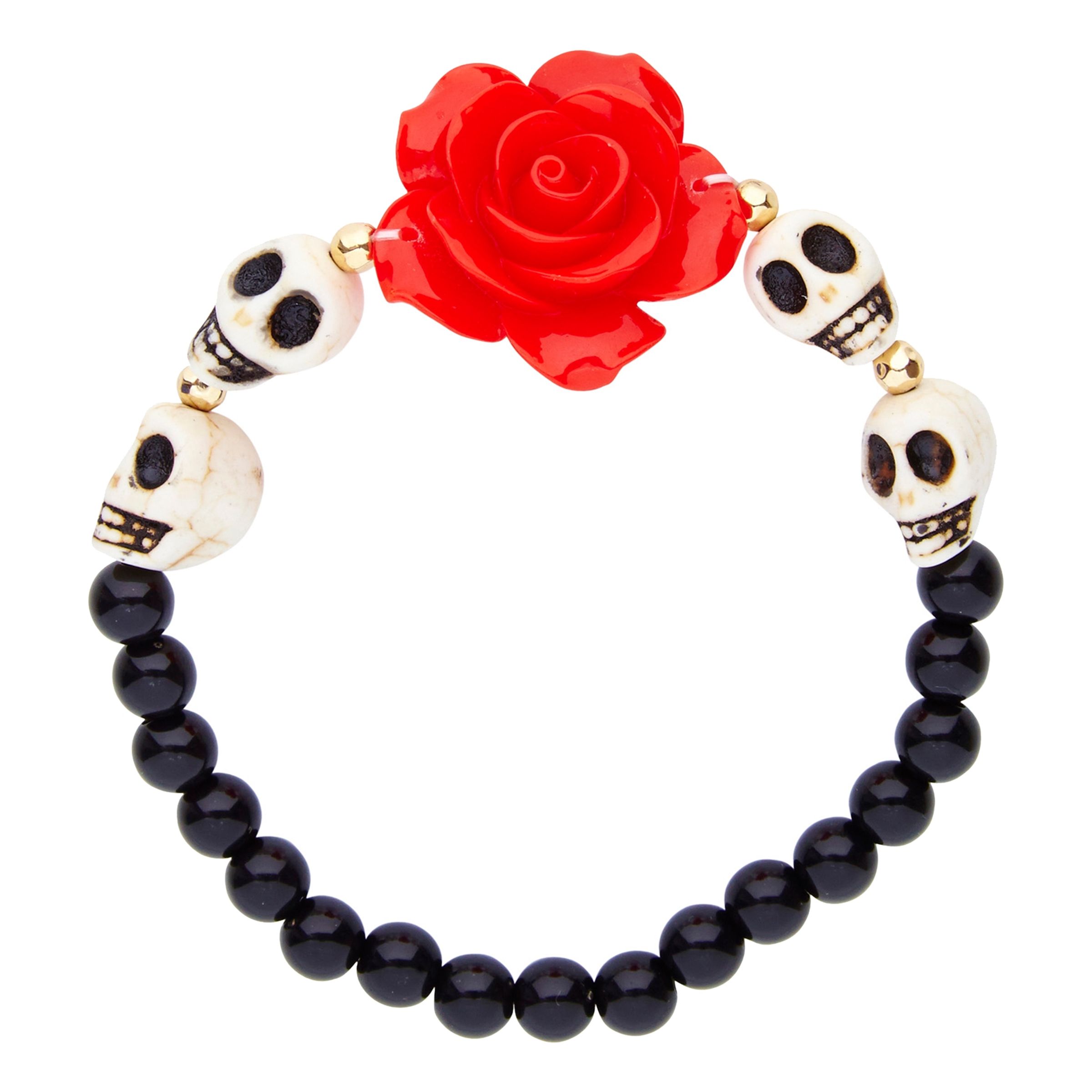 Day of the Dead Armband kommer med svarta pärlor och vita dödskallar med en tjusig röd ros samt små skimrande guldiga pärlor som ger den en äkta Day of the Dead-look.