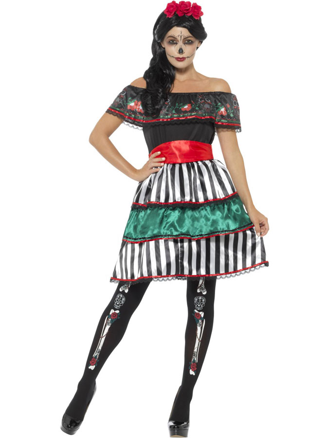 Day of the Dead Klänning Senorita omfattar en detaljrik klänning med en tre-lagers kjol som kommer i flera färger och mönster i temat Day of the Dead. Klänningen har ett resårband kring midja samt ärmar, och ett extra tyglager vid översta delen med tryck av dödskallar och rosor.