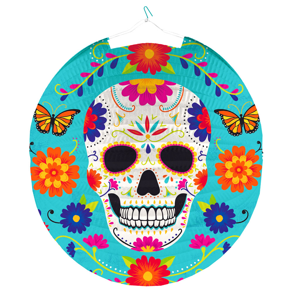 Day Of The Dead Lykta omfattar en blå papperslykta med dekorativt motiv av en suger skull, blommor och fjärilar. Lyktan är ca 25 cm stor och är försedd med en liten ljushållare som passar till smalare stearinljus.