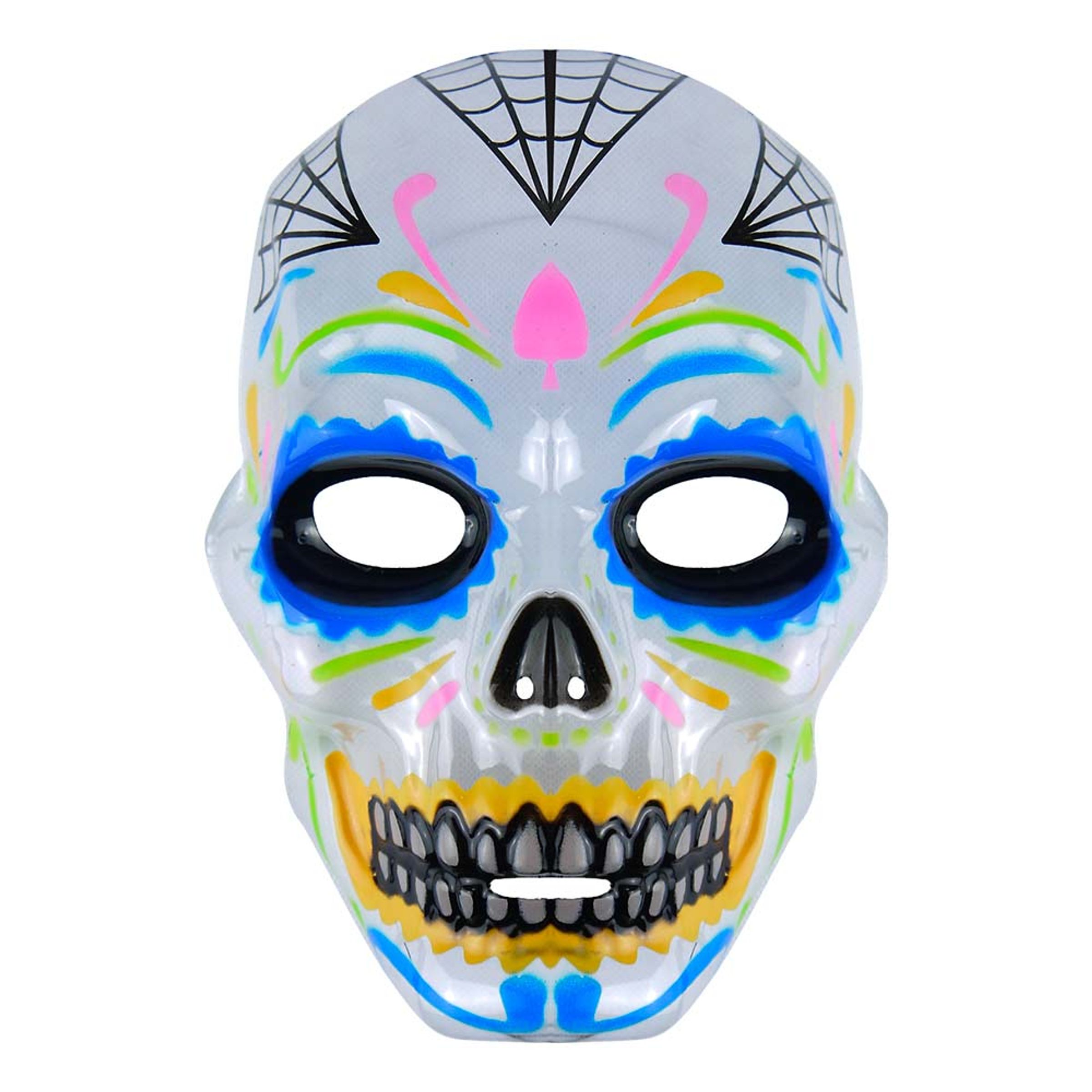 Day of the Dead Mask i Plast är en häftig, transparent dödskallemask med klassisk Day of the Dead-mönster i olika färger samt svart spindelnätsmönster upptill. Masken har hål vid ögon, näsa och mun och täcker endast ditt ansikte. Masken har små skumgummibitar på insidan så den sitter bekvämt mot ditt ansikte.