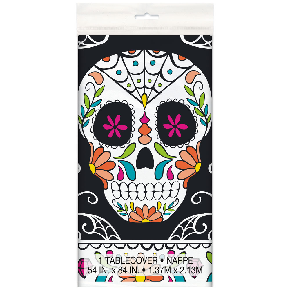 Day of the Dead Plastduk består av en svart bordsduk med motiv av färgglada mönster och blommor, samt en stor vit dödskalle med blommor. Tillverkad av plast.