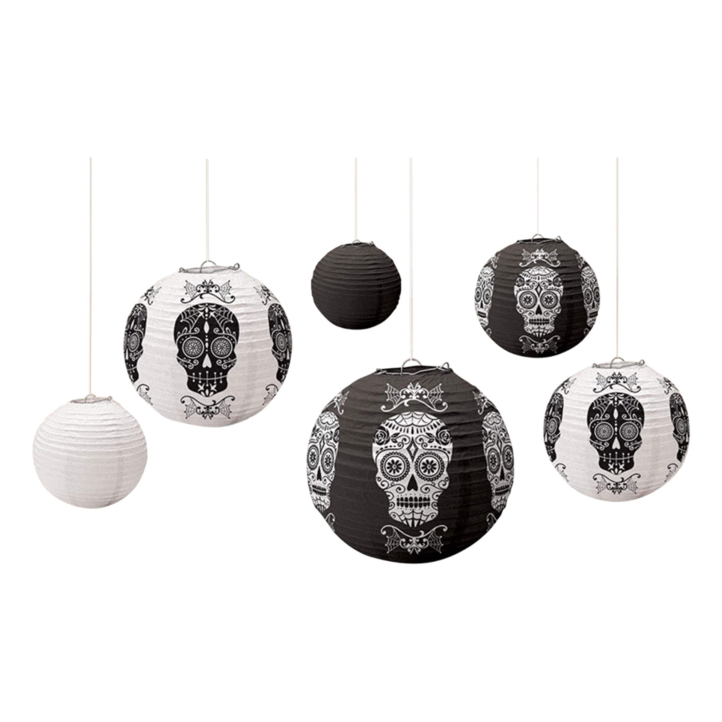 Day of the Dead Rislampor är en klassisk modell av en rislampa som man med fördel hänger i taket eller trädgården som dekoration inför olika högtider och fester. Just de här rislamporna gör sig nog bäst till halloweenfirandet i och med att de är svarta och vita med motiv av dödskallar. Det är den klassiska mexikanska Día de Muertos-dödskallen som pryder lyktorna, eller Sugar Skull som vi bättre känner den som. Levereras i 6-pack med tre olika storlekar av varje färg, de två minsta lyktorna är utan motiv.