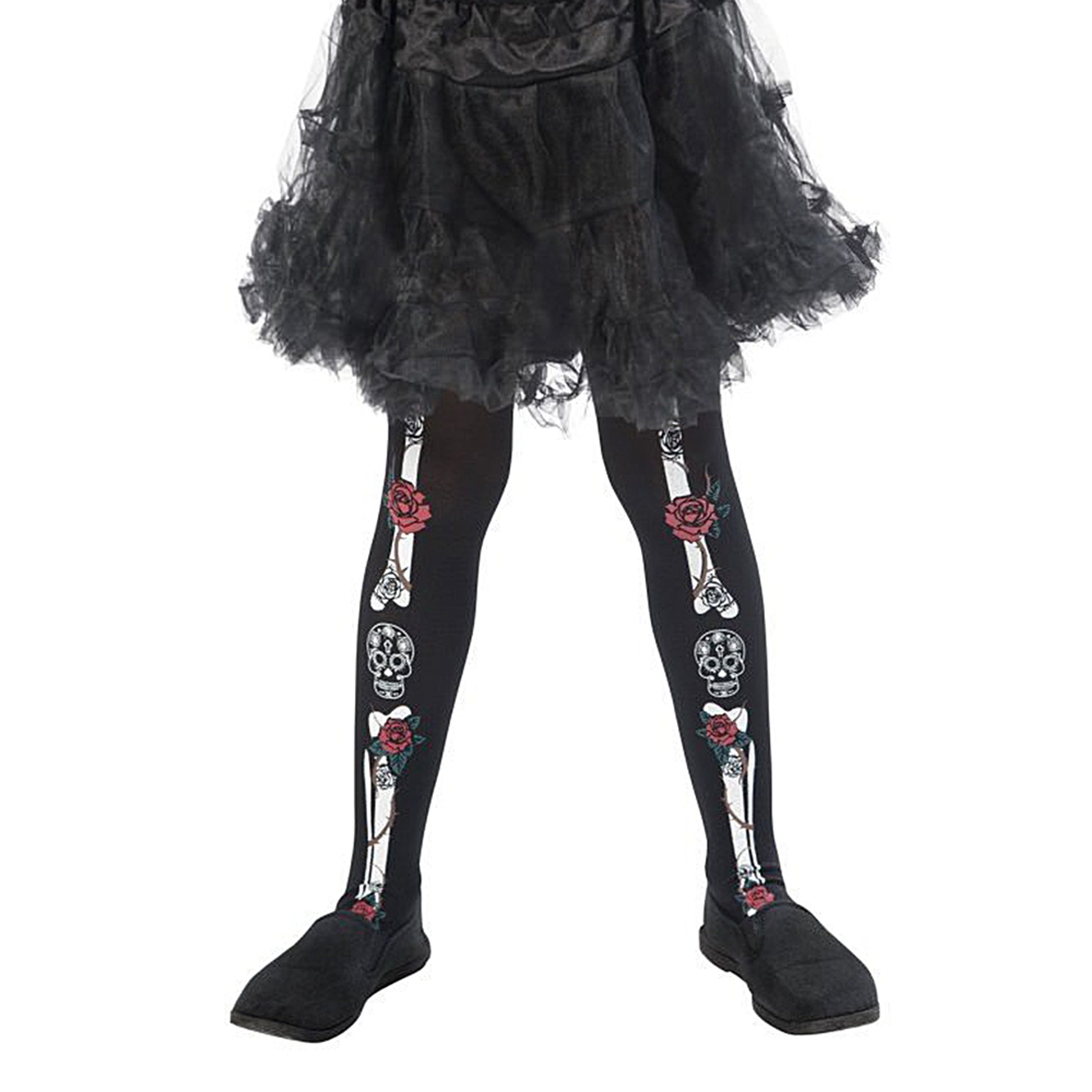 Dessa strumpbyxor för barn kommer i en svart färg och dekoreras av motiv av skelettben, döskallar och röda, vackra rosor. Perfekt när halloween nalkas.