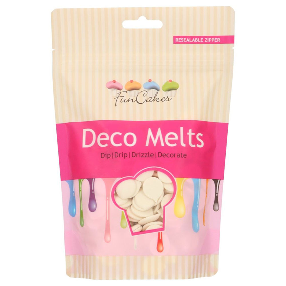Deco Melts Vit består av vita små deco melts med vit chokladsmak att smälta för dekorering av tårtor, cupcakes och andra bakverk. Önskar du ett tunnare resultat kan du blanda i några droppar vegetabilisk olja och om du önskar ett tjockare resultat kan du blanda i några droppar vatten.