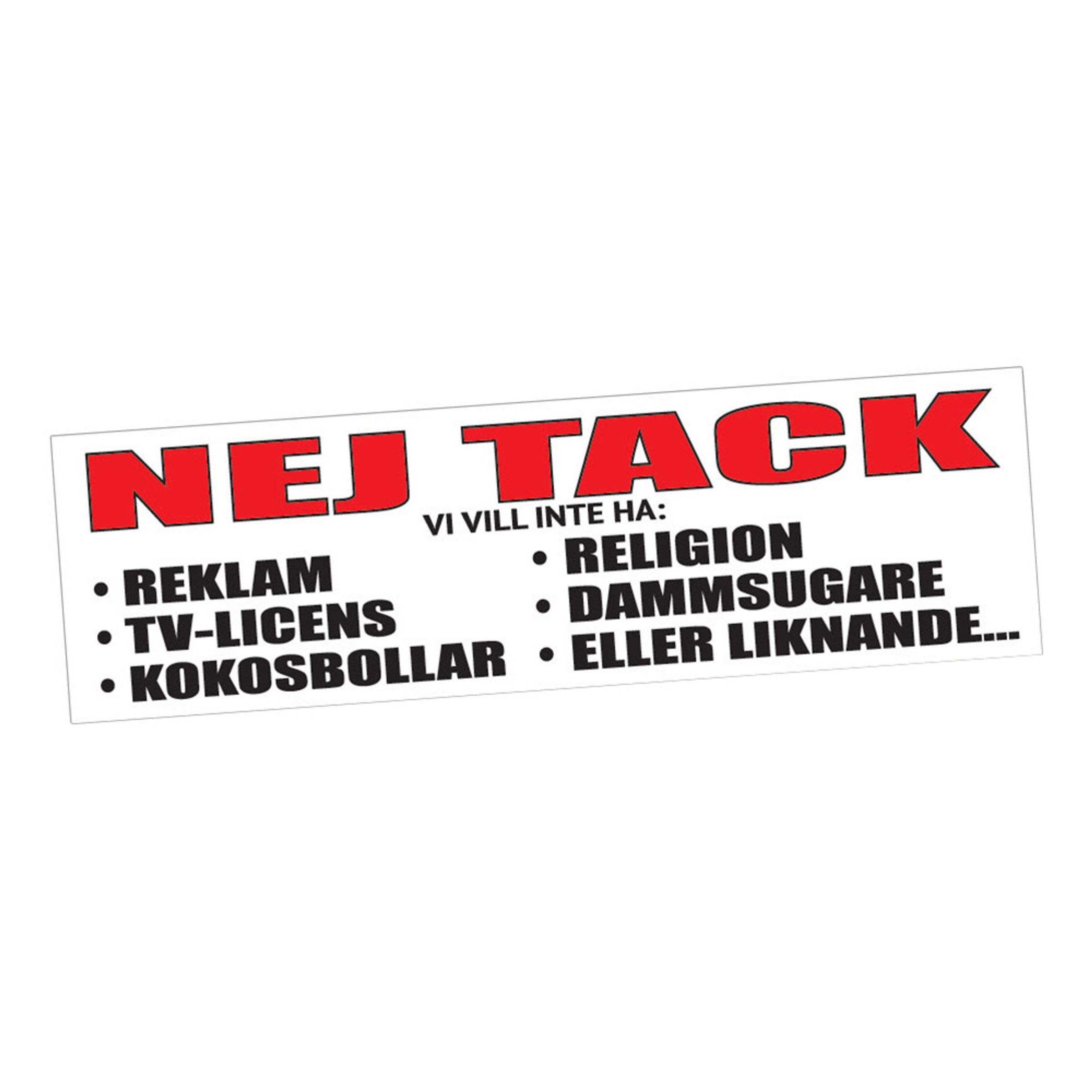 Dekal NEJ TACK! Ingen Reklam är en vit dekal. På skylten står det "Nej tack, vi vill inte ha: reklam, TV-licens, kokosbollar, religion, dammsugare eller liknande …" med röda och svarta bokstäver. Den är 14 x 4 cm stor och tillverkad i plast.