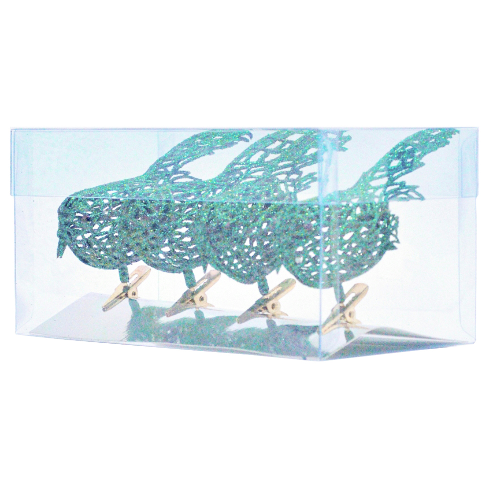 Dekorationsfåglar med Klämmor Grön består av gröna glittriga fåglar för dekoration med klämmor. Fåglarna är tillverkade av plast och klämman i metall. De mäter ungefär 8,5 centimeter i höjd och 7 centimeter i längd. Säljs i 4-pack.