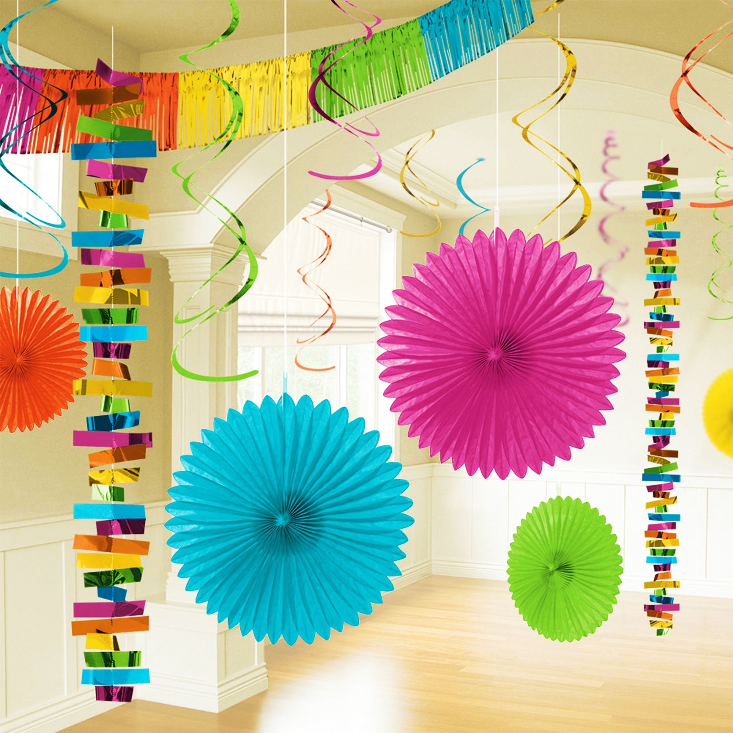 Dekorationskit Flerfärgad är en förpackning med kalasdekorationer i olika färger. Förpackningen innehåller 3 pappersfjädrar som är 20 cm långa, 2 pappersfjädrar som är 40 cm långa, 10 swirls som är 55 cm stora, 1 hängande dekoration som är 2,7 m lång och 2 fransgirlanger som är 2 m långa.