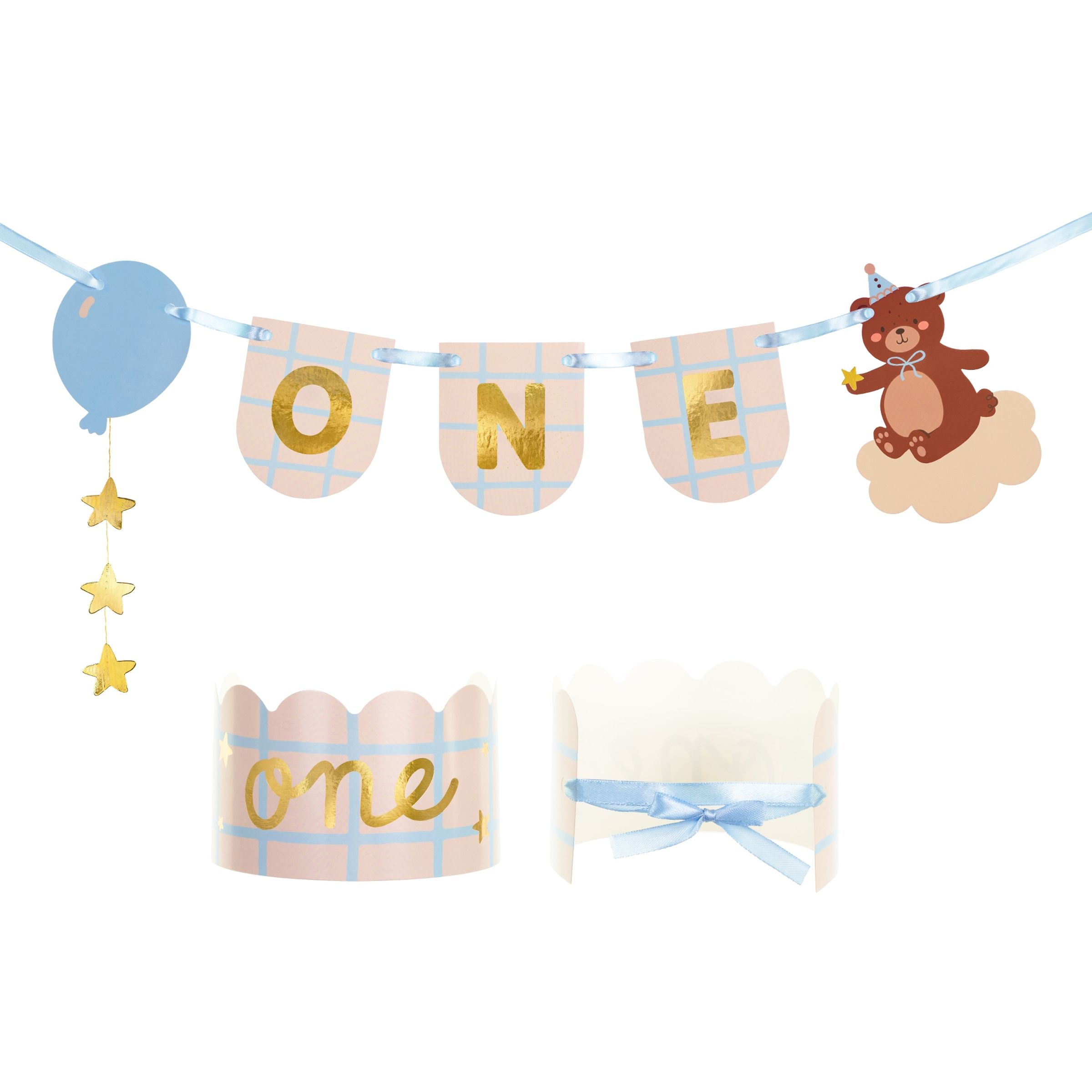 Dekorationskit för Stol Teddybjörn med Krona inkluderar en banderoll med texten "One"som fästs på barnstolen, samt en matchande papperskrona för födelsedagsbarnet att ha på huvudet. Perfekt att matcha med andra dekorationer och dukning ur samma kollektion!