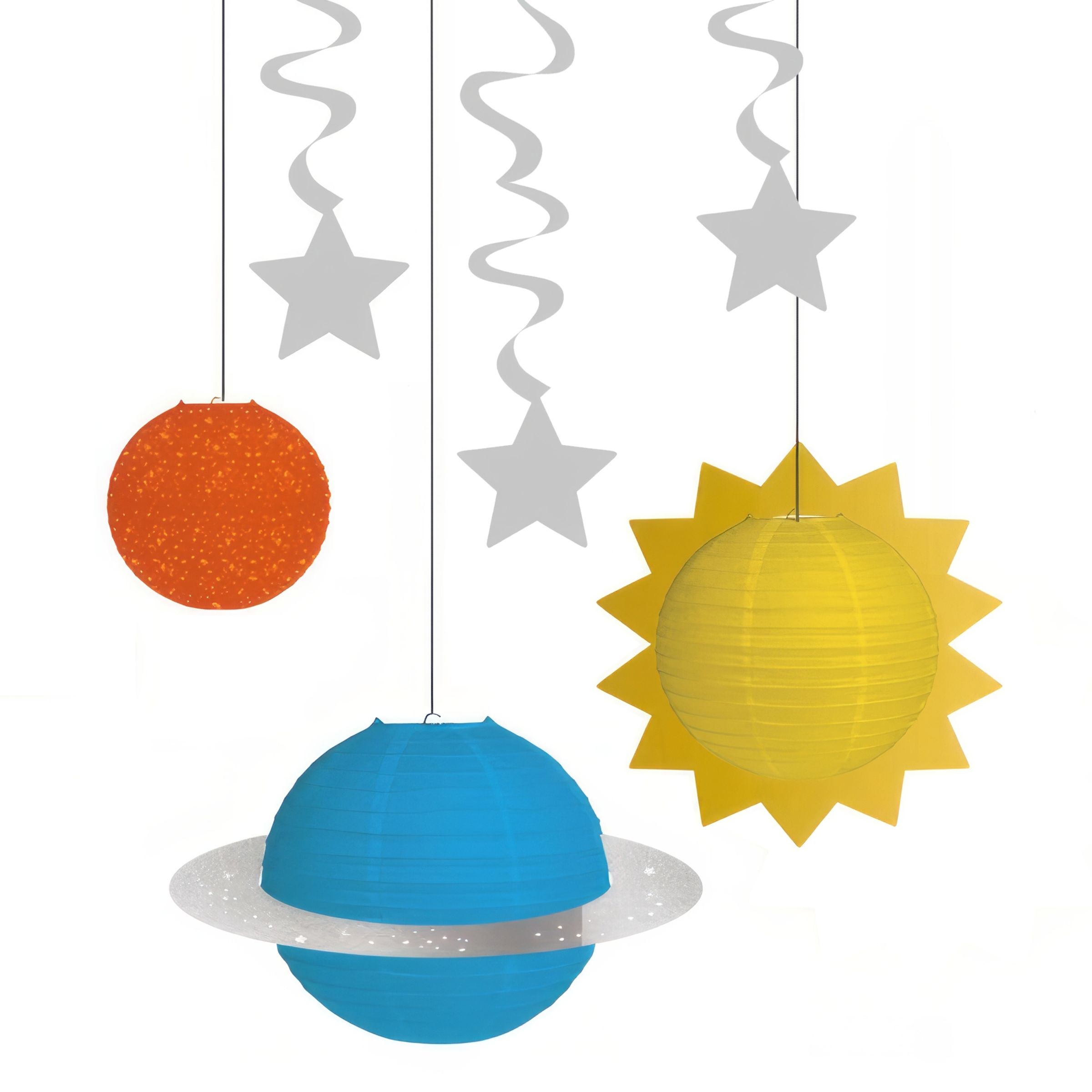 Dekorationskit Space Party är en förpackning med coola kalasdekorationer. Förpackningen innehåller 3 x swirls med stjärnor längst ned samt 3 x hängande dekorationer med planeter. Perfekt till kalaset med rymdtema!