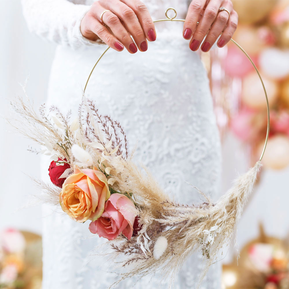 Dekorationsringar Guld omfattar 2 stycken guldiga metallringar i olika storlekar. Den stora ringen är ca 28 cm stor och den lilla ringen är ca 20 cm stor. Ringarna har även små öglor för enkel upphängning.