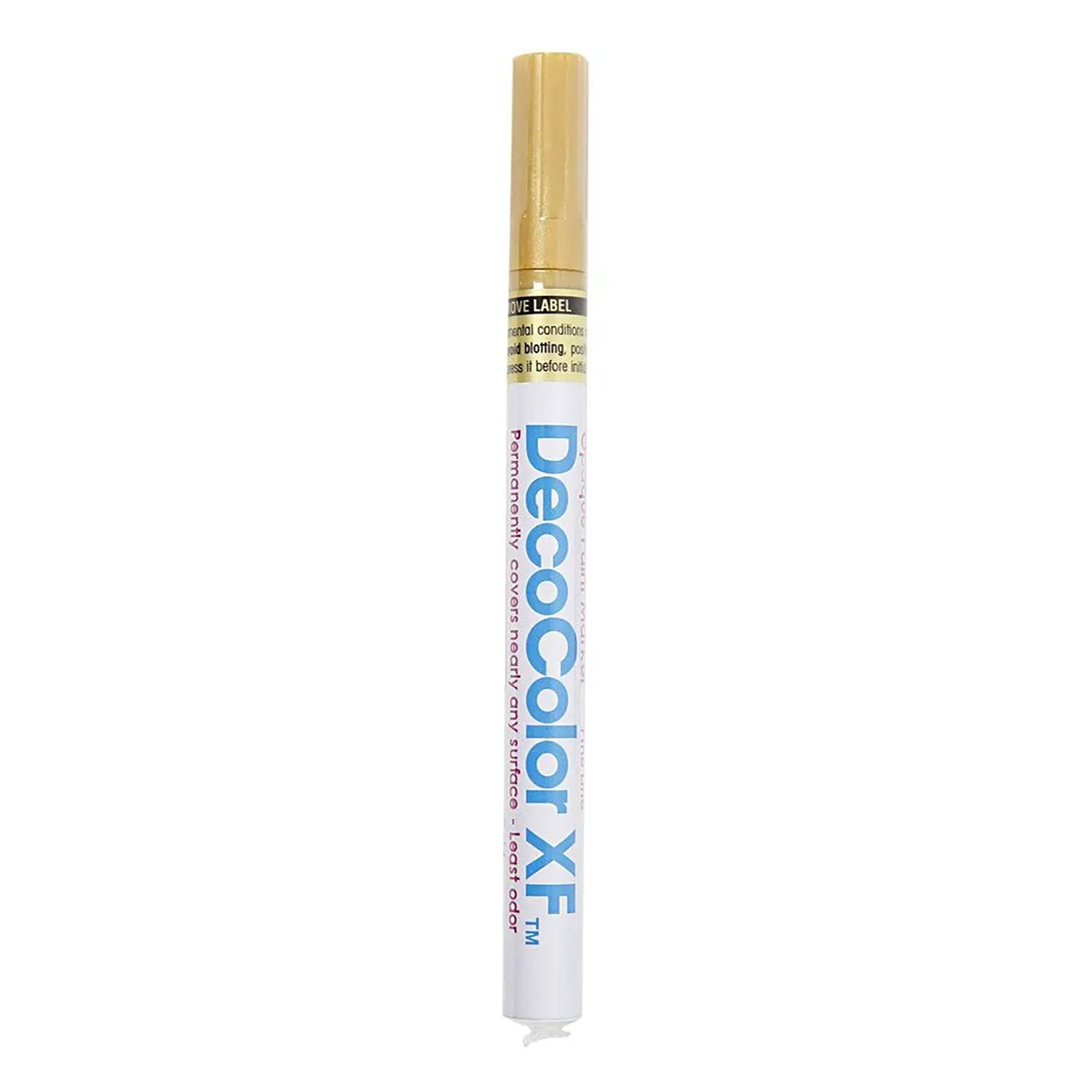 Dekorationstusch Guld Smal Spets är en permanent penna med metallisk guldfärg. Att pennan är permanent innebär att färger inte går bort, och bör därför ej användas av små barn.