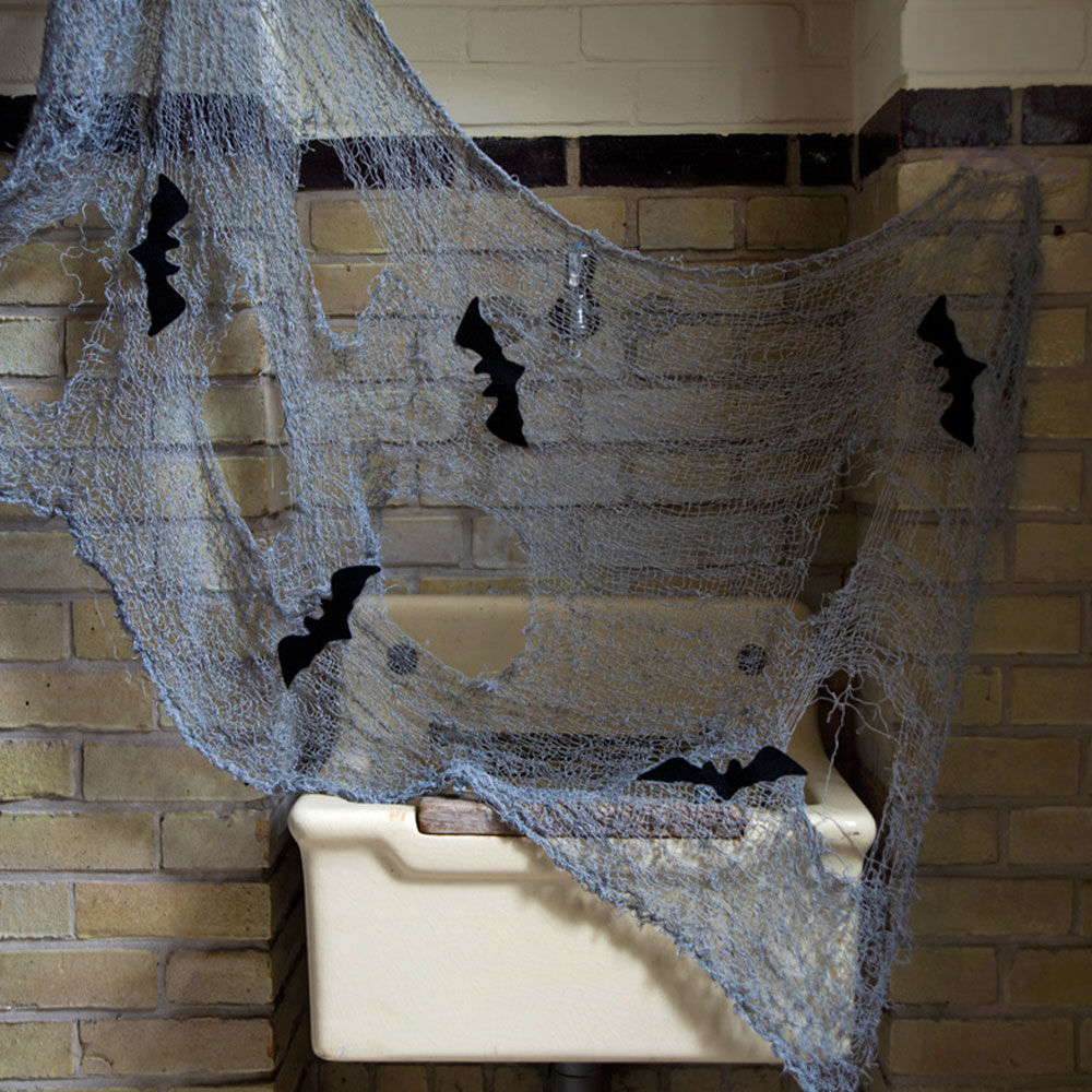 Läskigt halloween draperi med fladdermöss som garanterat höjer skräckstämningen! Häng upp detta tygstycke mot en vägg, i taket eller tillsammans med andra halloweendekorationer och få genast till en riktigt skrämmande pyntning. Ett måste för alla som vill ta halloweenpyntningen till nästa nivå!