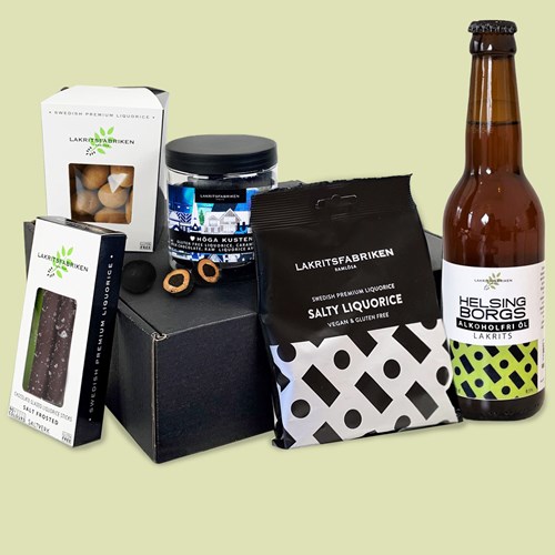 I presentlådan finns en blandning av söt och salt lakrits med och utan choklad samt roliga och unika produkter som alkoholfri lakritsöl. En delikatesslåda med spännande produkter och smaker för den som älskar lakrits!