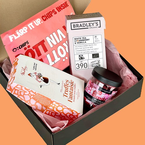 Då är vår delikatesslåda i rosa och rött tema det perfekta valet! Presentlådan innehåller delikatesser som chips med smak av tryffel och parmesan, te med smak av jordgubb och vanilj, chokladtryfflar med smak av hallon och gourmetlakrits doppad i vit choklad smaksatt med jordgubbe. En riktigt härlig mix av goda smaker!